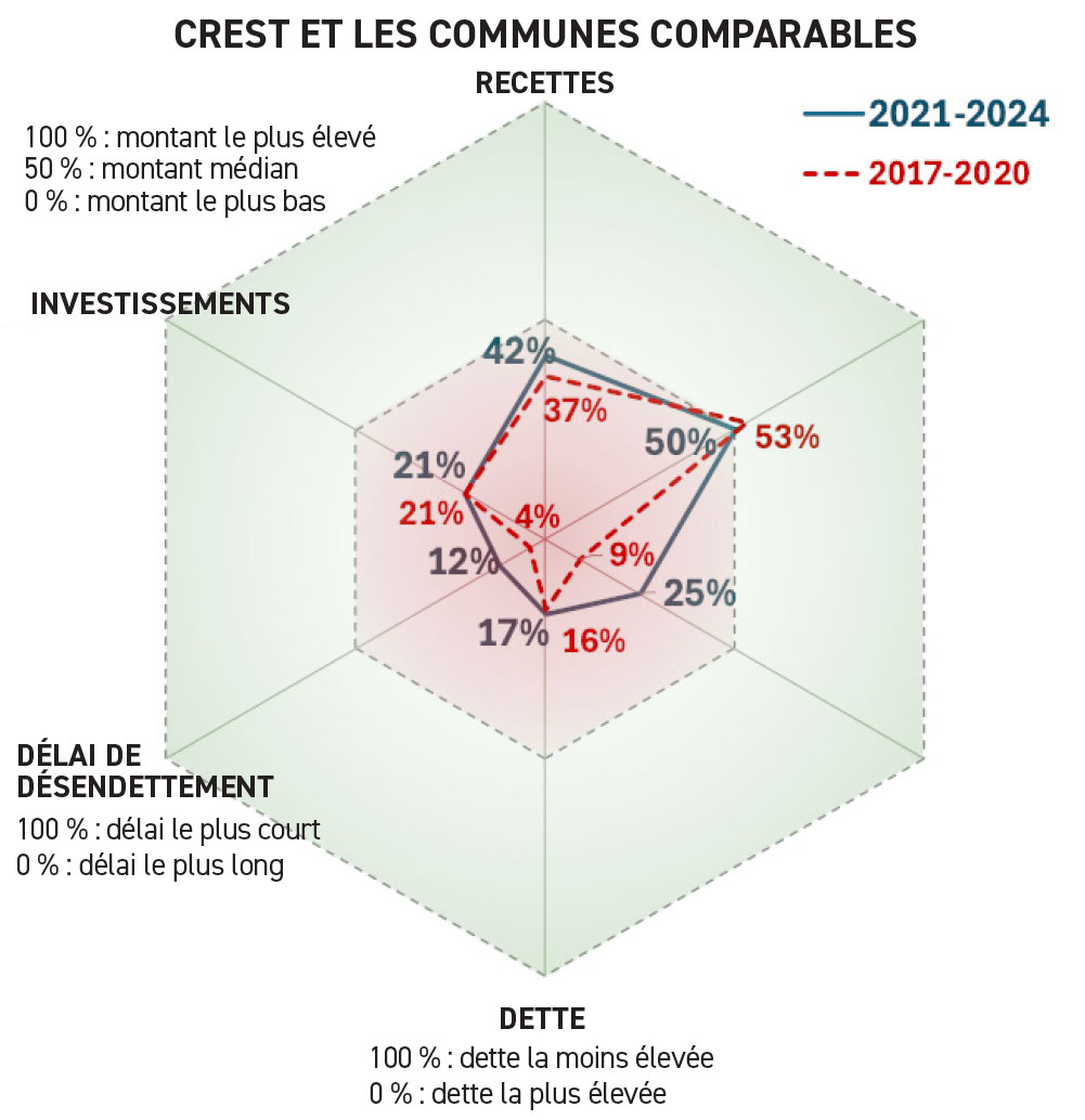 À Crest, les recettes par habitant sont, en moyenne pour la période 2021-2024, de 1 091 euros, contre 1 238 euros pour les communes comparables (soit - 12 %). Cet écart s’est légèrement réduit par rapport à la mandature précédente (2017-2020 : - 14 %). Les dépenses par habitant sont, en moyenne sur 2021-2024, de 952 euros, contre 1 028 euros pour les communes comparables (soit - 7 %). Cet écart s’est légèrement accru par rapport au mandat précédent...