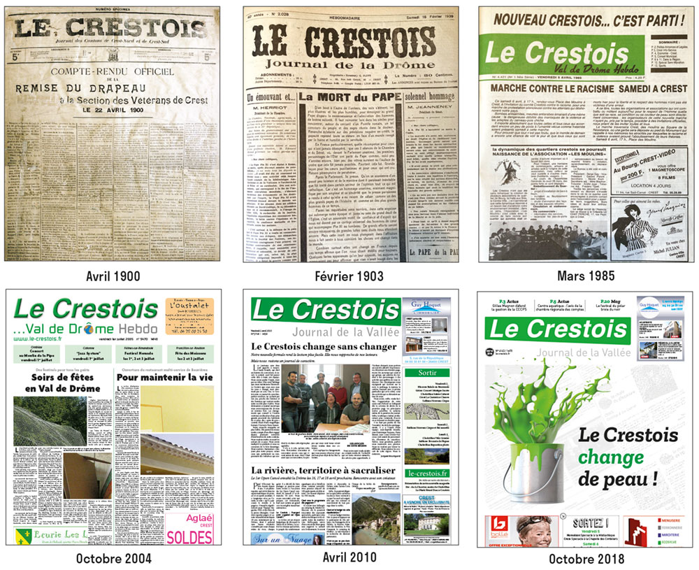 Passé la surprise que provoquera sans doute en vous la découverte du nouveau logo et de la nouvelle maquette du Crestois, nous espérons que vous retrouverez y vite vos habitudes. Que par-delà les nouvelles “polices”, les nouveaux folios, les “grilles” de page et autres artefacts propres à l’édition de la presse que nous avons remis au goût du jour, vous retrouverez Le Crestois que vous connaissiez jadis : celui qui, sous la plume de ses journalistes, de ses correspondant·es dans les villages de la vallée, de ses chroniqueurs et chroniqueuses, de ses mille-et-un contributeurs et contributrices, vous propose, toutes les semaines depuis plus d’un siècle, un reflet en récits et en images de notre belle vallée.