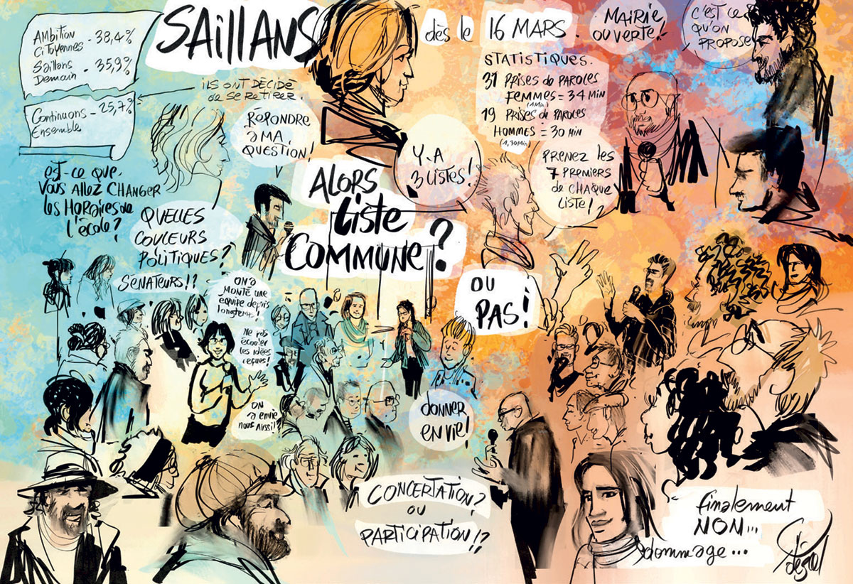 Étaient conviés les membres de la liste Saillans demain, menée par Agnès Hatton, qui a recueilli 35,87 % (339 voix), et ceux de Continuons ensemble pour Saillans, conduite par Pascale Dardier, qui a obtenu 25,71 % (243 voix). La participation s’est élevée à 75,48 %.