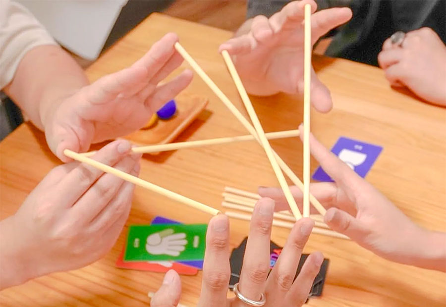 Dans une partie de Yubibo, on rigole, on tend sa main et on crie sur son voisin ou sa voisine qui relâche son doigt et qui fait tomber un bâtonnet. Ça vous paraît fou ? Voilà le concept que propose ce jeu coopératif de dextérité. À son tour, on pioche une carte et on place un bâtonnet entre l’un de nos doigts et celui d’un·e joueur·euse indiqué·e par la carte.