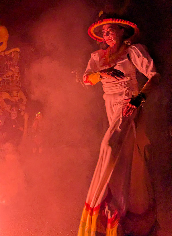 Rien de tout cela cette année, où les artistes en résidence et les habitués de la Gare ont su recréer avec talent un Jour des morts mexicain, tradition née au début du XXe siècle pour valoriser la nation mexicaine – un mélange osé de religions, de culture espagnole et natives mais aussi de couleurs, et de squelettes pas effrayants pour un sou. De très nombreux spectateurs avaient pris l’invitation au mot, et étaient venus grimés singulièrement en Frida Kahlo sans son handicap (Le Crestois a cru voir la même jeune fille vingt fois !) ou en déguisements variés sur le thème d’Halloween.