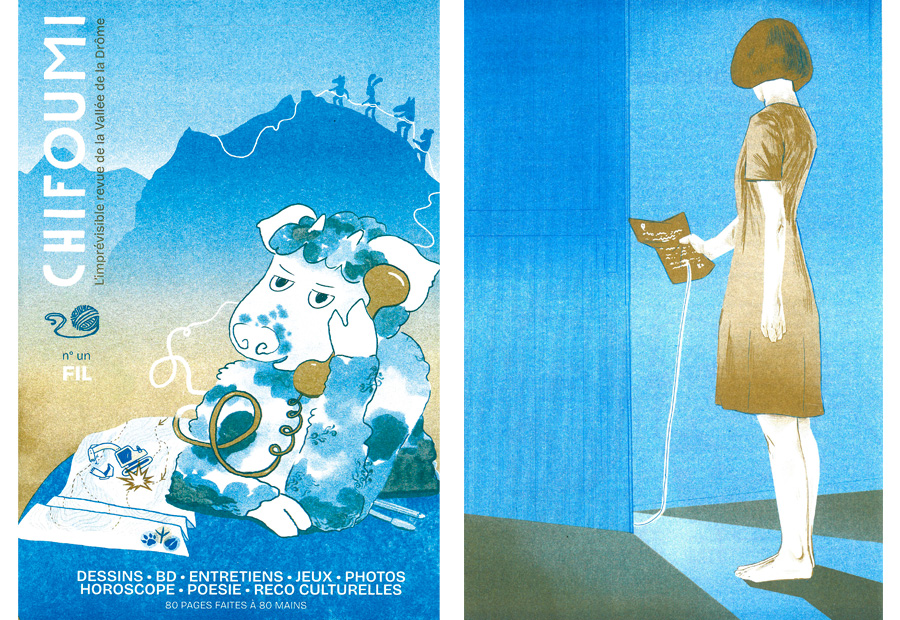 Imprimé à l’atelier Risome, rue de la République à Crest, ce beau magazine édité en risographie (avec des teintures végétales) et en bichromie (après le violet et l’orange, place au bleu et marron) offre au regard comme à la lecture une délassante promenade sur le thème, cette fois-ci, du fil. Un fil rouge pour raconter des histoires, allant de la Drôme à la Cisjordanie en BD, dressant le portrait des marionnettistes de la compagnie Calamine de Piégros-la-Clastre, offrant un horoscope un peu fou-fou, des poésies ou une réflexion sur la santé mentale...