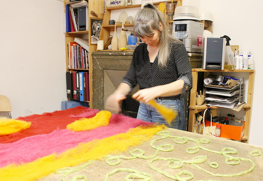 Birgit me reçoit dans son atelier au-dessus de la Grainerie, rue Gal Berlier. « Si ça ne t’embête pas, je vais continuer à travailler, car avec le froid, les commandes de semelles arrivent et je dois m’en occuper rapidement » me dit-elle en étalant de belles nappes de laine feutrée colorée. Ainsi, au cours de l’heure et demie que durera notre entretien, je verrai l’étoffe en construction : les quatre nappes de laine arrosées d’eau savonneuse étalées sur une natte de raphia, le tapis ainsi formé enroulé sur un tube de PVC puis « roulé » énergiquement d’avant en arrière. C’est la méthode mongole : « Le rouleau de feutre était traîné dans la steppe par un cheval ou un chameau... », précise la feutrière.